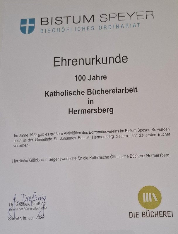 Die Katholische Öffentliche Bücherei (KÖB) Hermersberg feierte am 9. Juli 2023 ihr 100-jähriges Jubiläum.